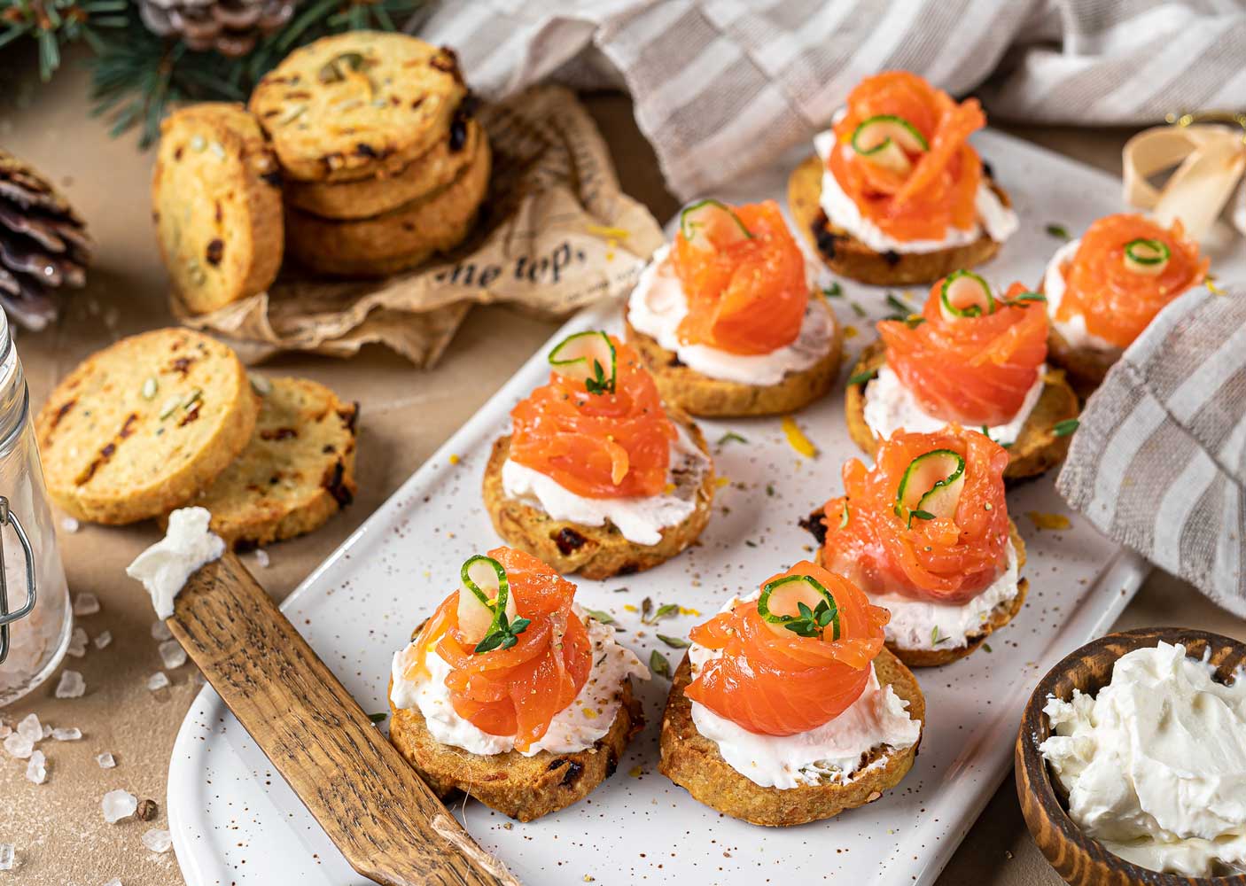 - На каждое печенье положить по 1 ч.л. сыра, сверху аккуратно выложить кусочки рыбы.