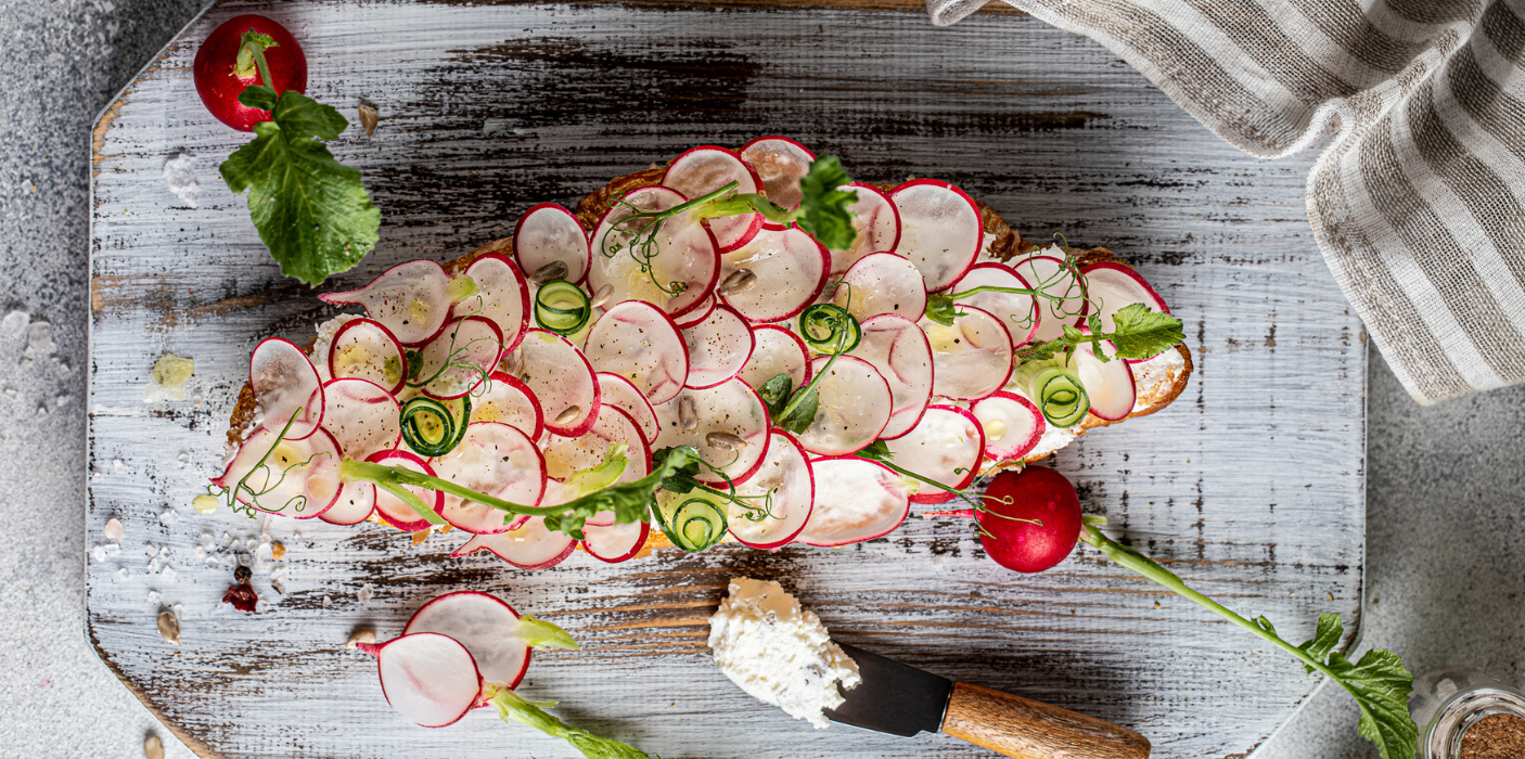 - Щедро смажьте их сливочным сыром, красиво разложите редиски, зелень, сбрызните оливковым маслом и посыпьте черным перцем и хлопьями морской соли.