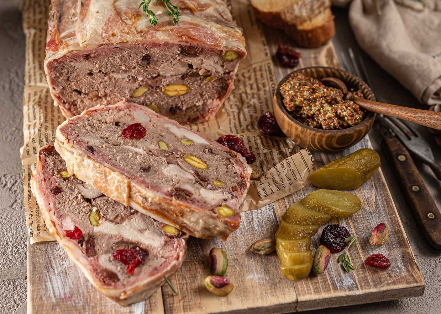 - Подавать террин холодным с зерненой горчицей или соусами на основе горчицы, соленьями и поджаренным хлебом.