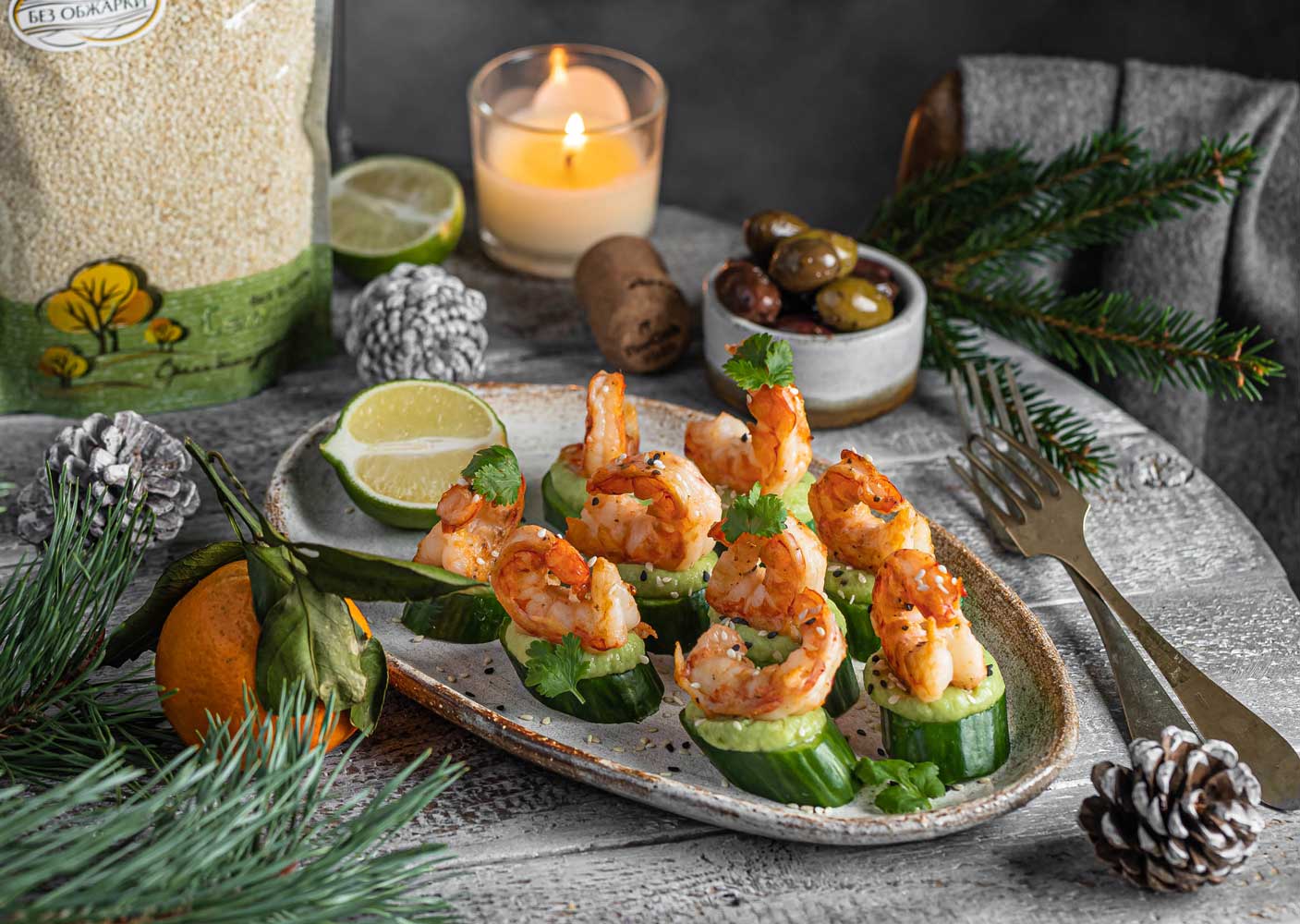 - На каждый огурец выложите немного пюре из авокадо, а сверху поставьте креветку.