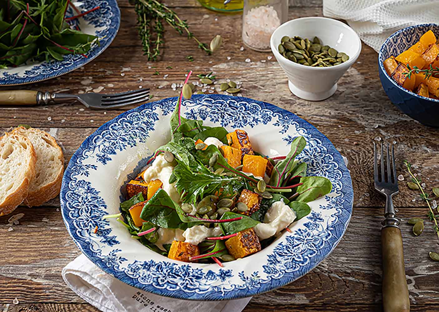 - В большую миску выложить зелень, тыкву, полить заправкой и приправить. Аккуратно перемешать руками.