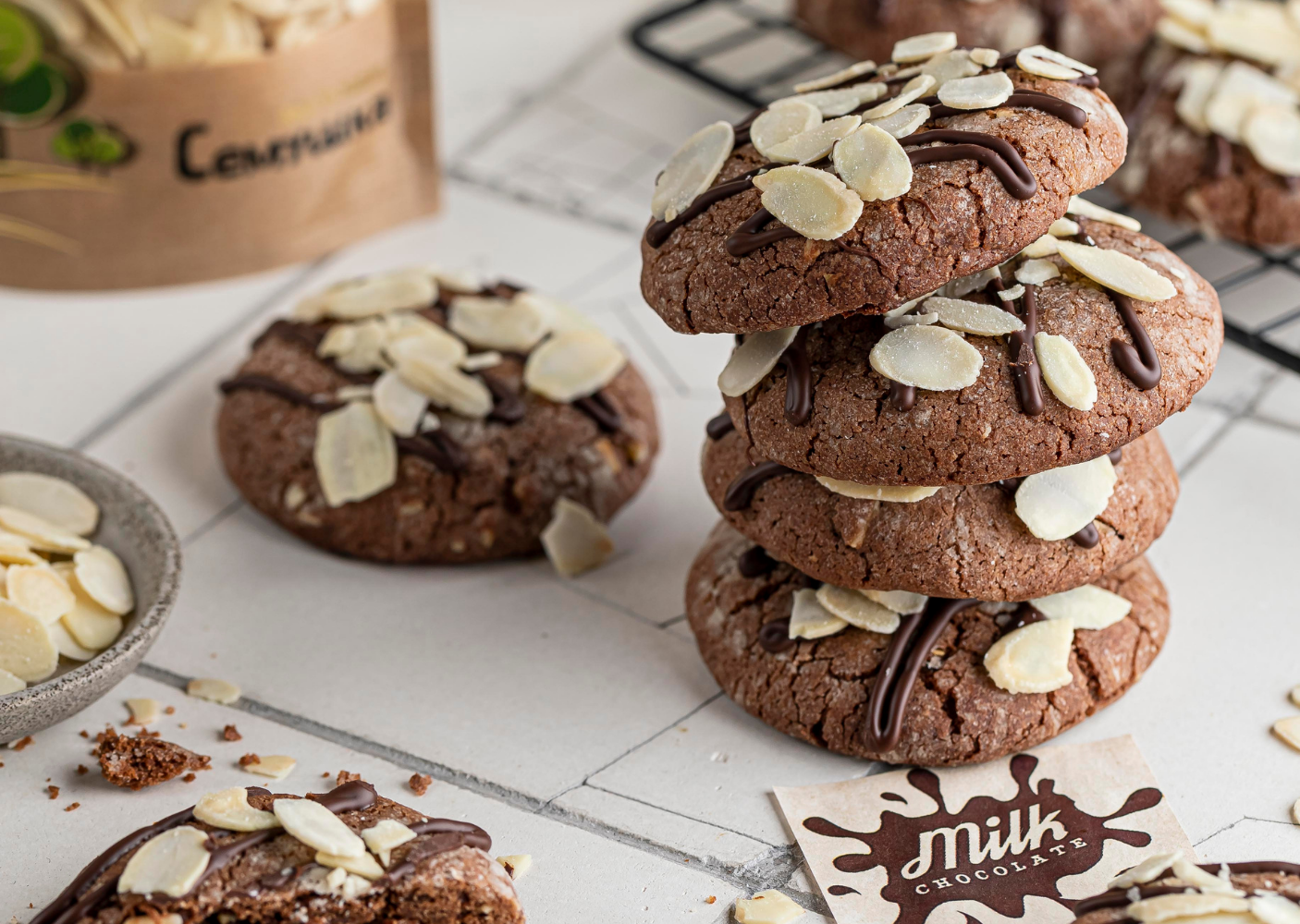 - Пока шоколад не застыл, посыпьте печенья миндальными лепестками.