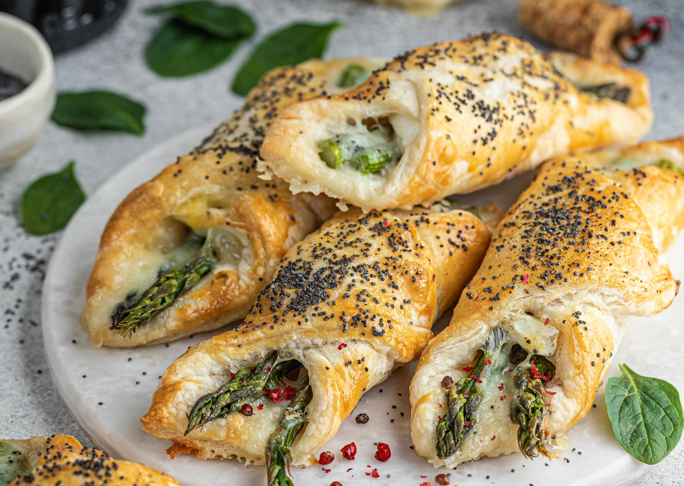 - Положите спаржу с ветчиной на тесто, сверху кусочек сыра и заверните свободные края теста справа и слева друг на друга.