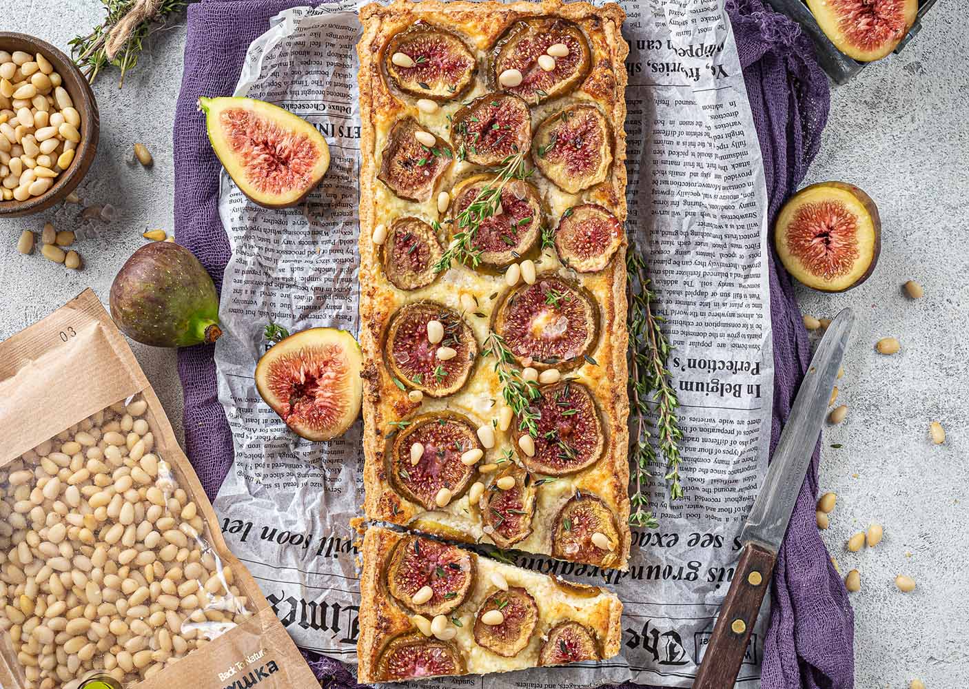 - Инжир нарезать поперек кружочками и разложить сверху на сырную начинку.
