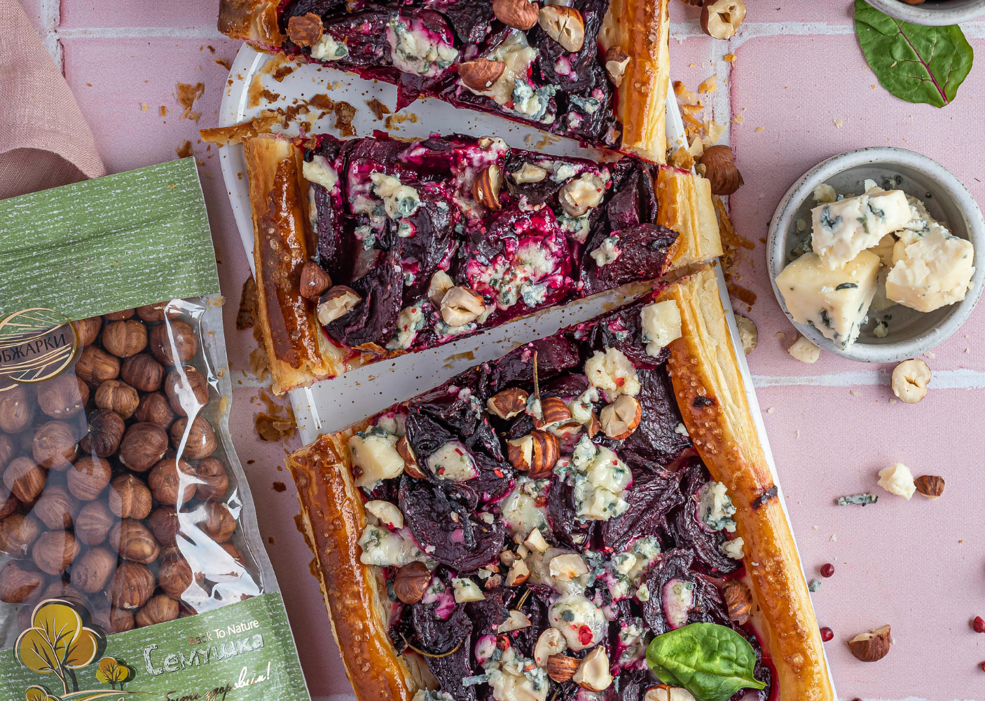 - На готовый горячий тартин накрошите голубой сыр и посыпьте крупно рубленным фундуком.