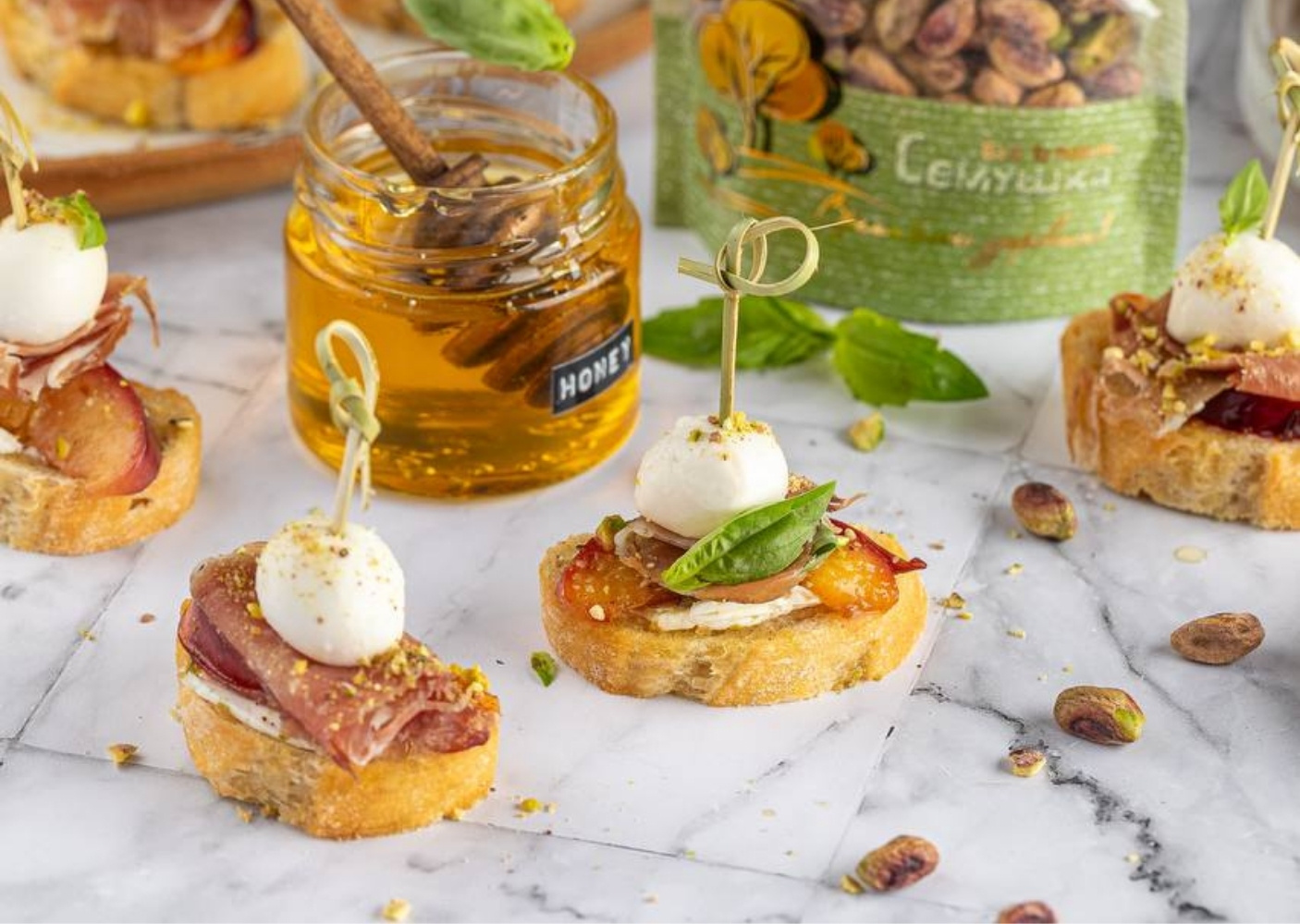 - Положите кусочек фрукта. Полейте медом и присыпьте фисташками.