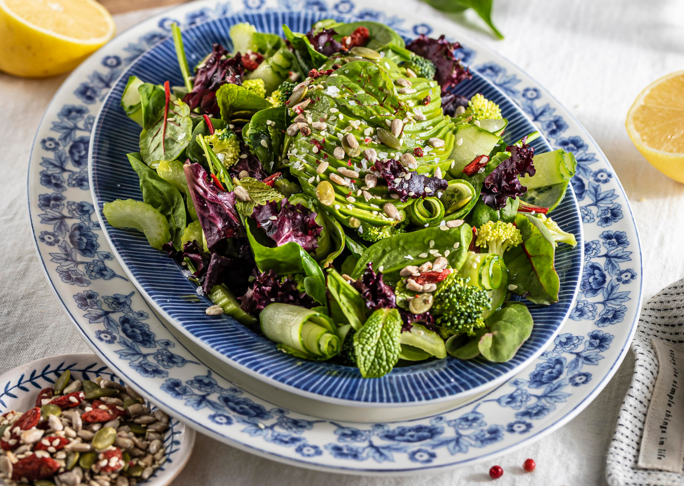 - На сервировочное блюдо выложите салатный микс, брокколи, сельдерей и авокадо. Полоски огурца сверните в спиральки и украсьте ими салат.